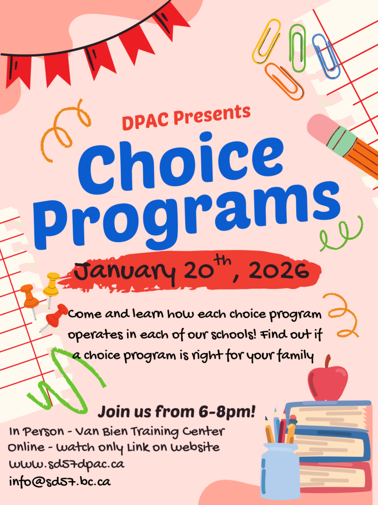 We welcome all parents and caregivers interested in the Choice School Options available through SD57 to join us and our guests from these programs to hear about what they offer and how they differ from the mainstream program in SD57.